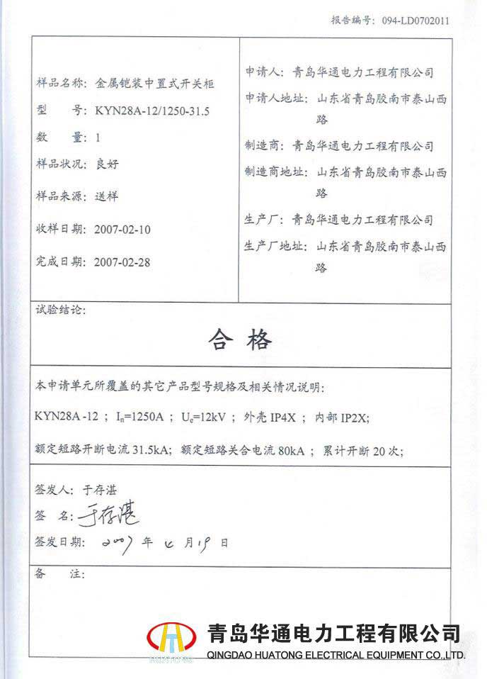 KYN61-40.5高壓開關(guān)柜型式試驗(yàn)報(bào)告