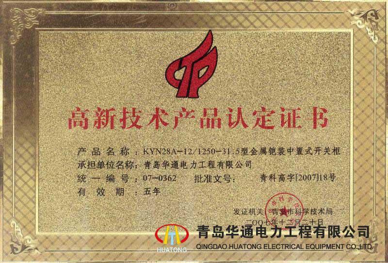 YBM-12高壓/低壓預(yù)裝式變電站高新技術(shù)產(chǎn)品認(rèn)定證書